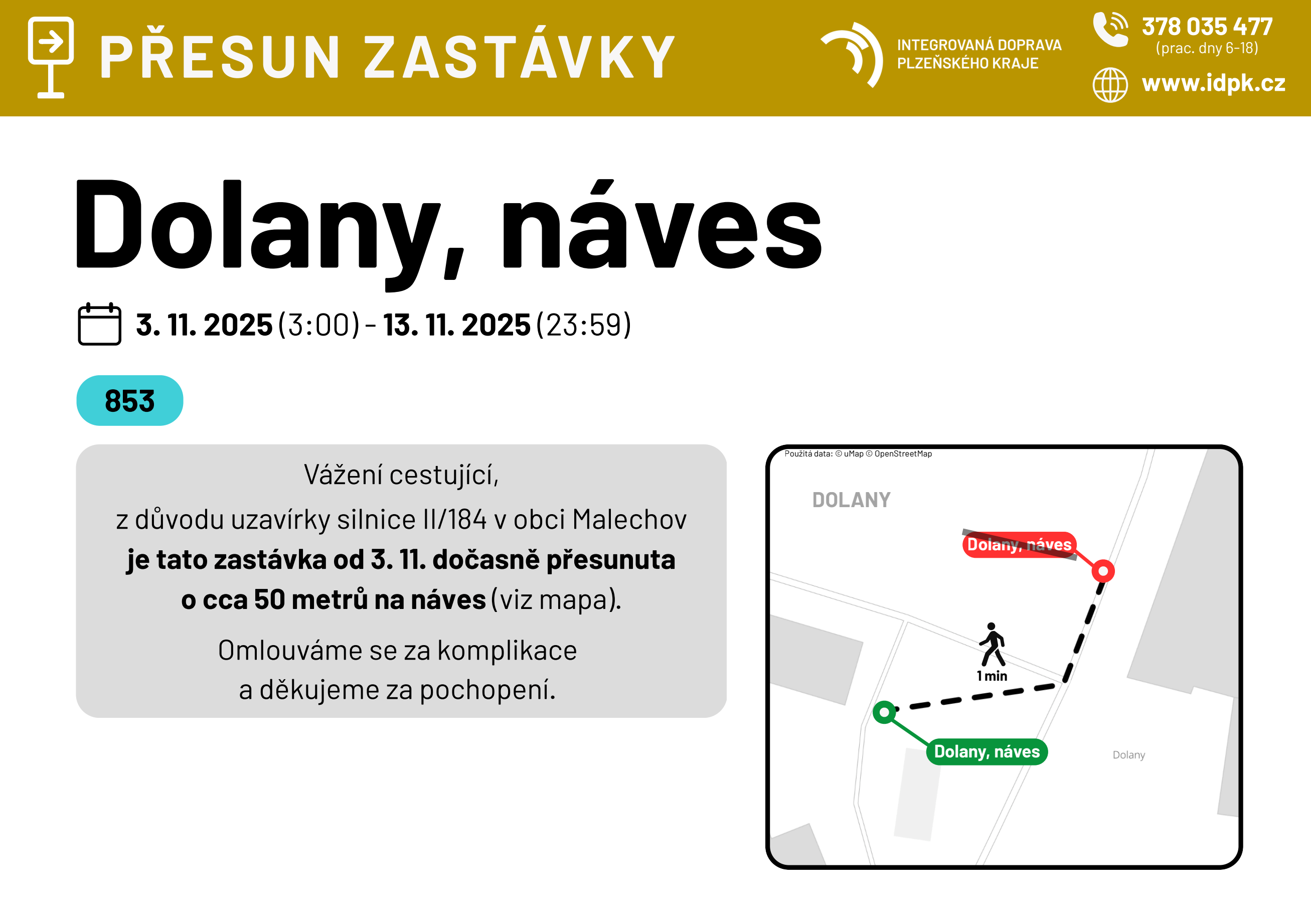 - Dolany, Malechov (pouze pro linku 853) o cca 280 metrů východně, přibližně před dům ev. 1 (viz vývěska níže);