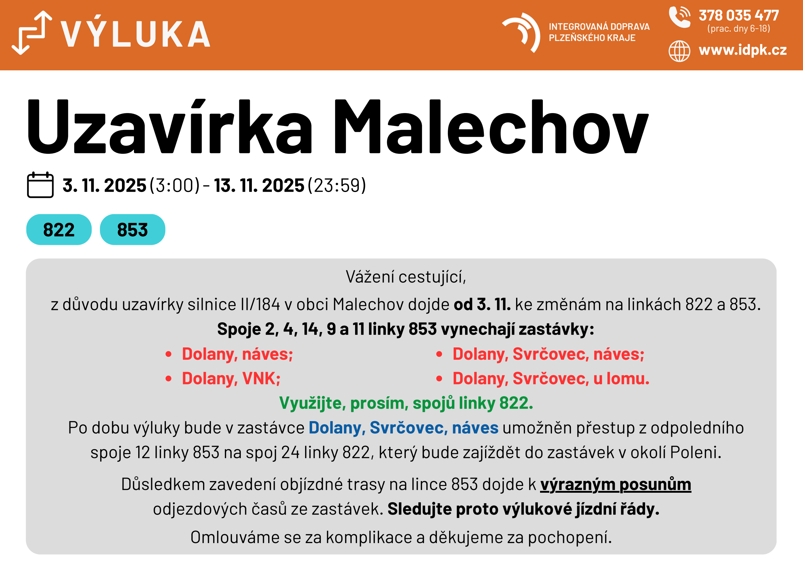 Po dobu výluky bude v zastávce Dolany, Svrčovec, náves umožněn přestup z odpoledního spoje 12 linky 853 na spoj 24 linky 822, který bude zajíždět do zastávek v okolí Poleni.