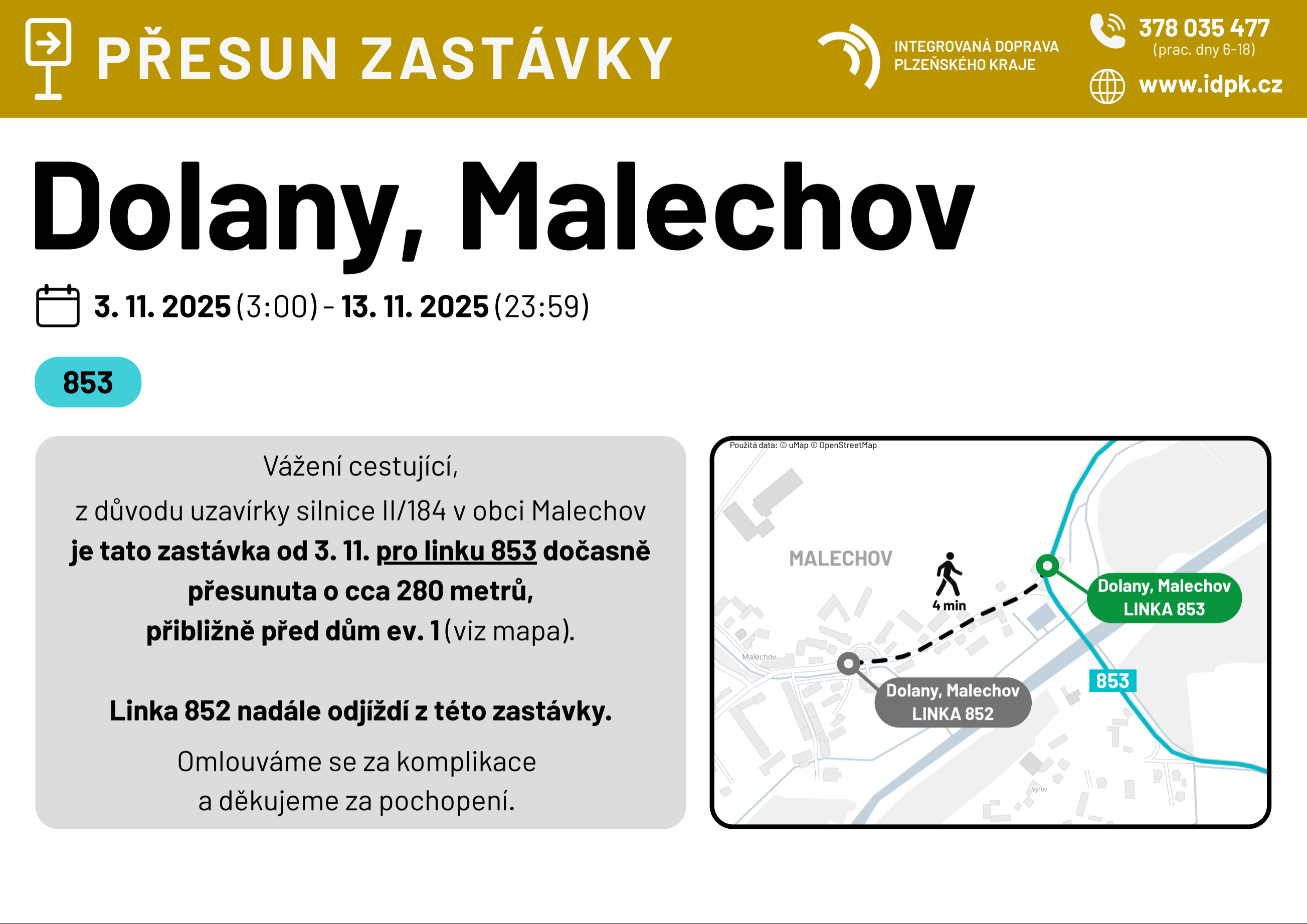 Z důvodu uzavírky silnice II/184 v obci Malechov dojde od 3. 11. ke změnám na linkách 822 a 853.
