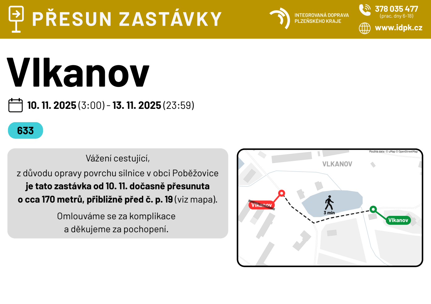 Od 10. 11. navíc dojde k dočasnému přesunu zastávky Vlkanov o cca 170 metrů, přibližně před dům č. p. 19 (viz vývěska níže).