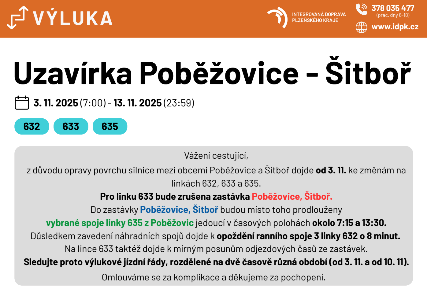 Z důvodu opravy povrchu silnice mezi obcemi Poběžovice a Šitboř dojde od 3. 11. (3:00) ke změnám na linkách 632, 633 a 635.