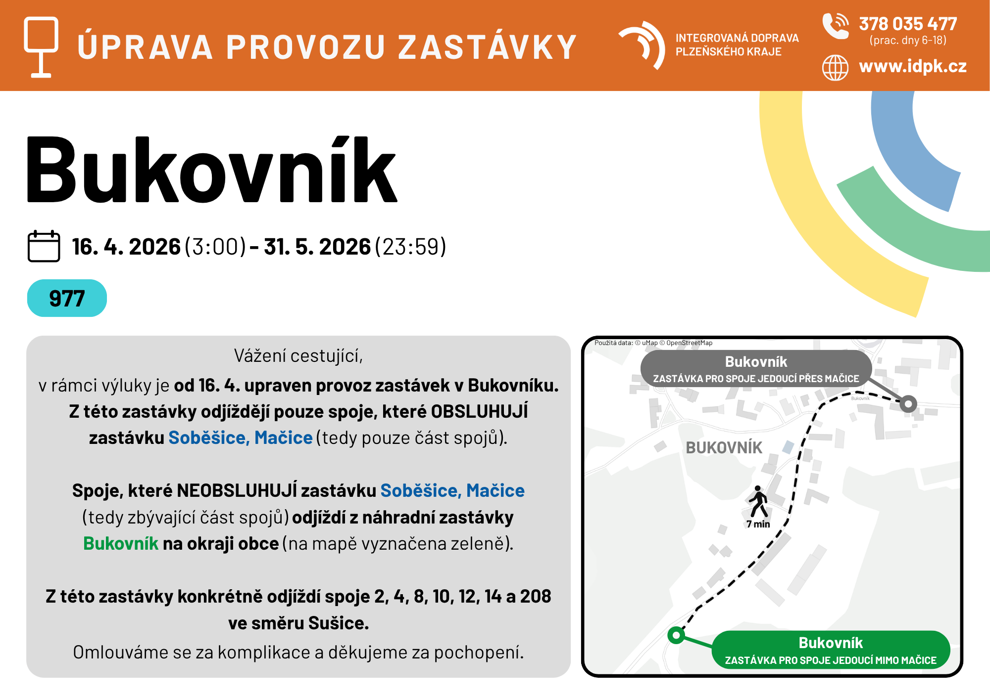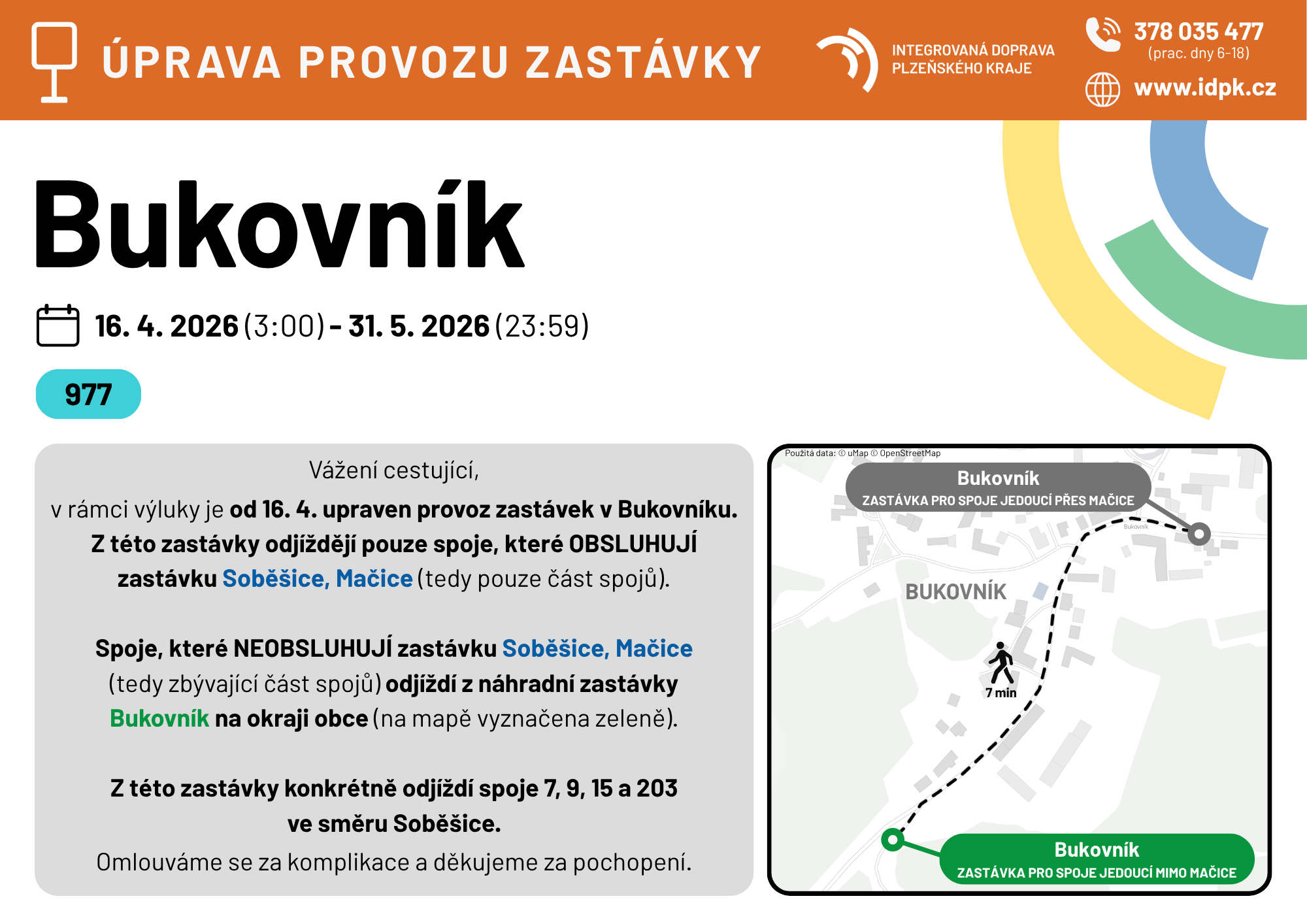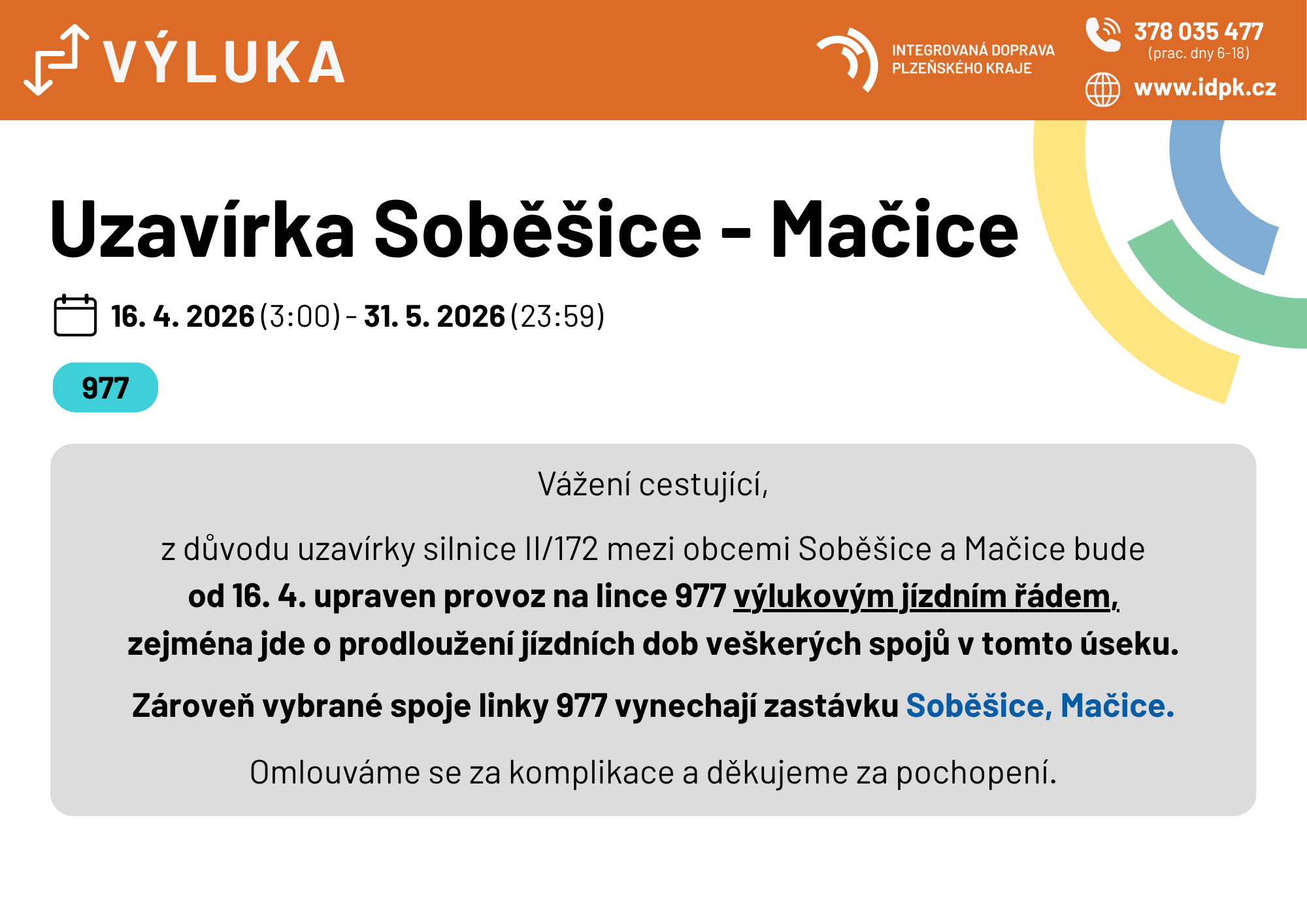 Na lince 977 bude provoz řízen výlukovým jízdním řádem, zejména dojde k prodloužení jízdních dob veškerých spojů v úseku Bukovník - Soběšice, Mačice - Soběšice.