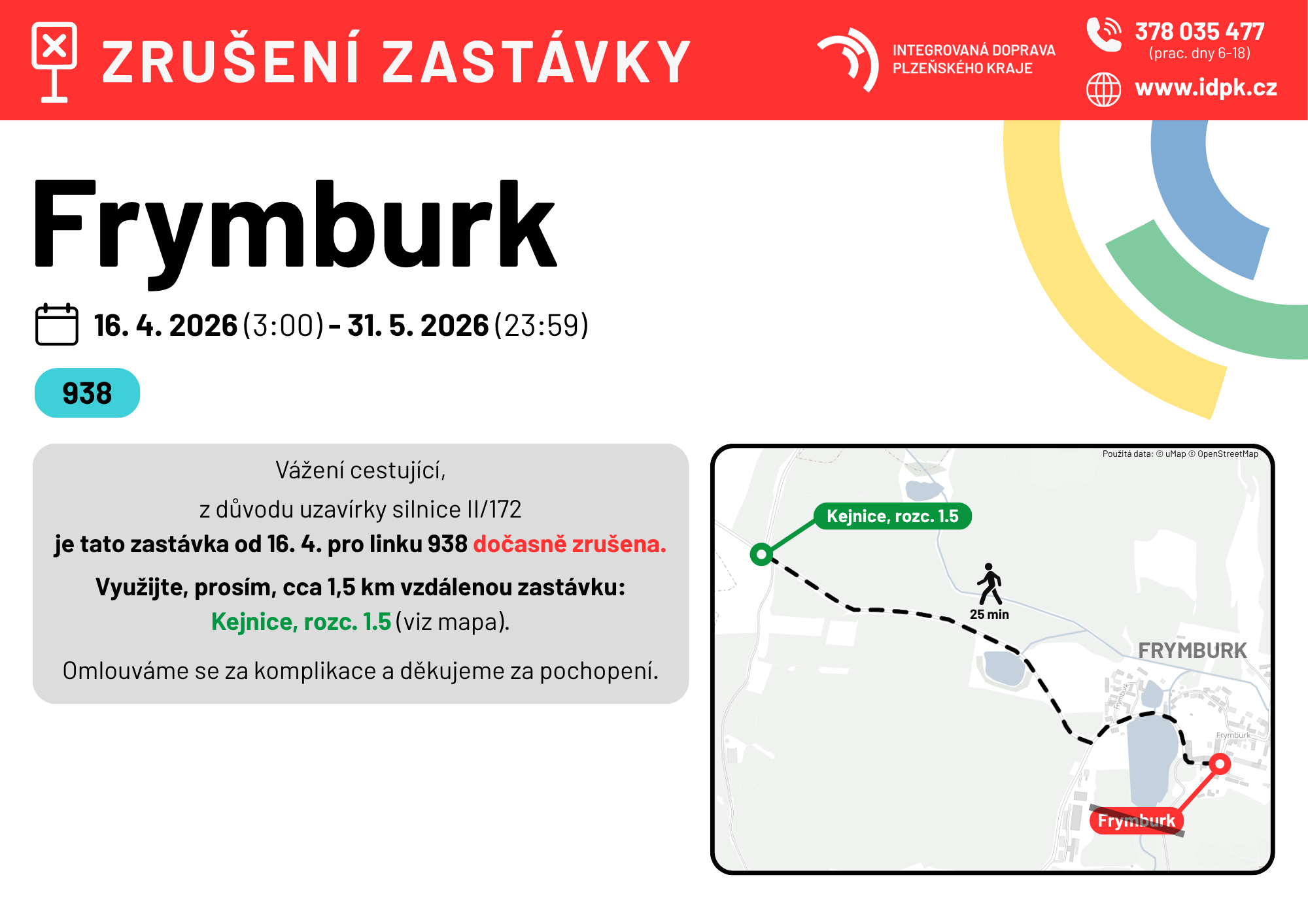 Pro linku 938 bude zrušena zastávka Frymburk. Lze využít cca 1,5 km vzdálené náhradní zastávky Kejnice, rozc. 1.5 (viz Vývěska níže).