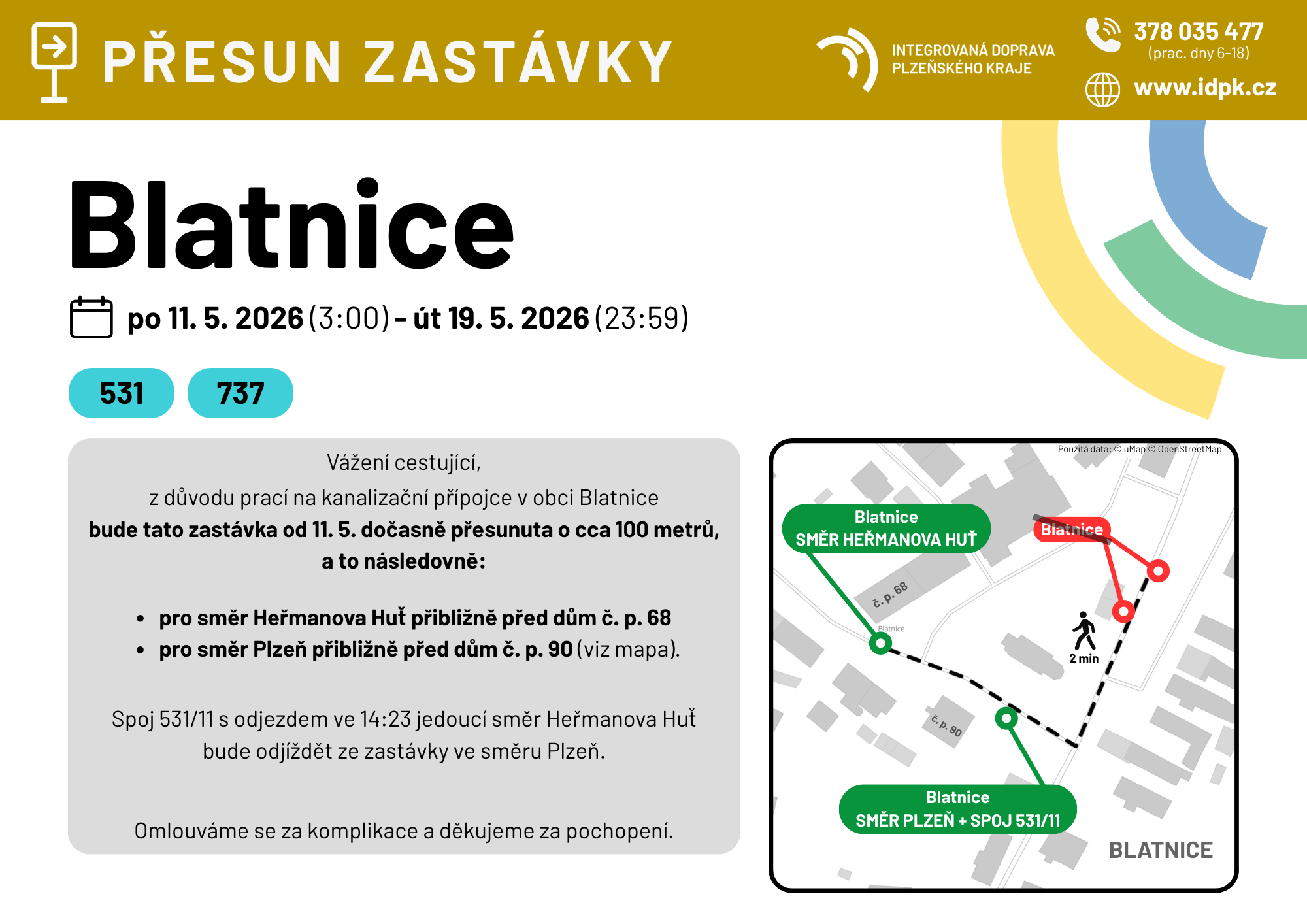 Z důvodu prací na kanalizační přípojce v obci Blatnice dojde od 11. 5. k dočasnému přesunu zastávky Blatnice o cca 100 metrů, a to následujícím způsobem: