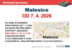 Z důvodu stavebních prací v Malesicích budou od 7. 4. 2026 dlouhodobě přeloženy zastávky „Malesice“ pro linky 11, 35, 37 a N5 z Malesické návsi o cca 300m blíže k Plzni k Sousoší sv. Jana Nepomuckého v ulici Ke Kostelu.