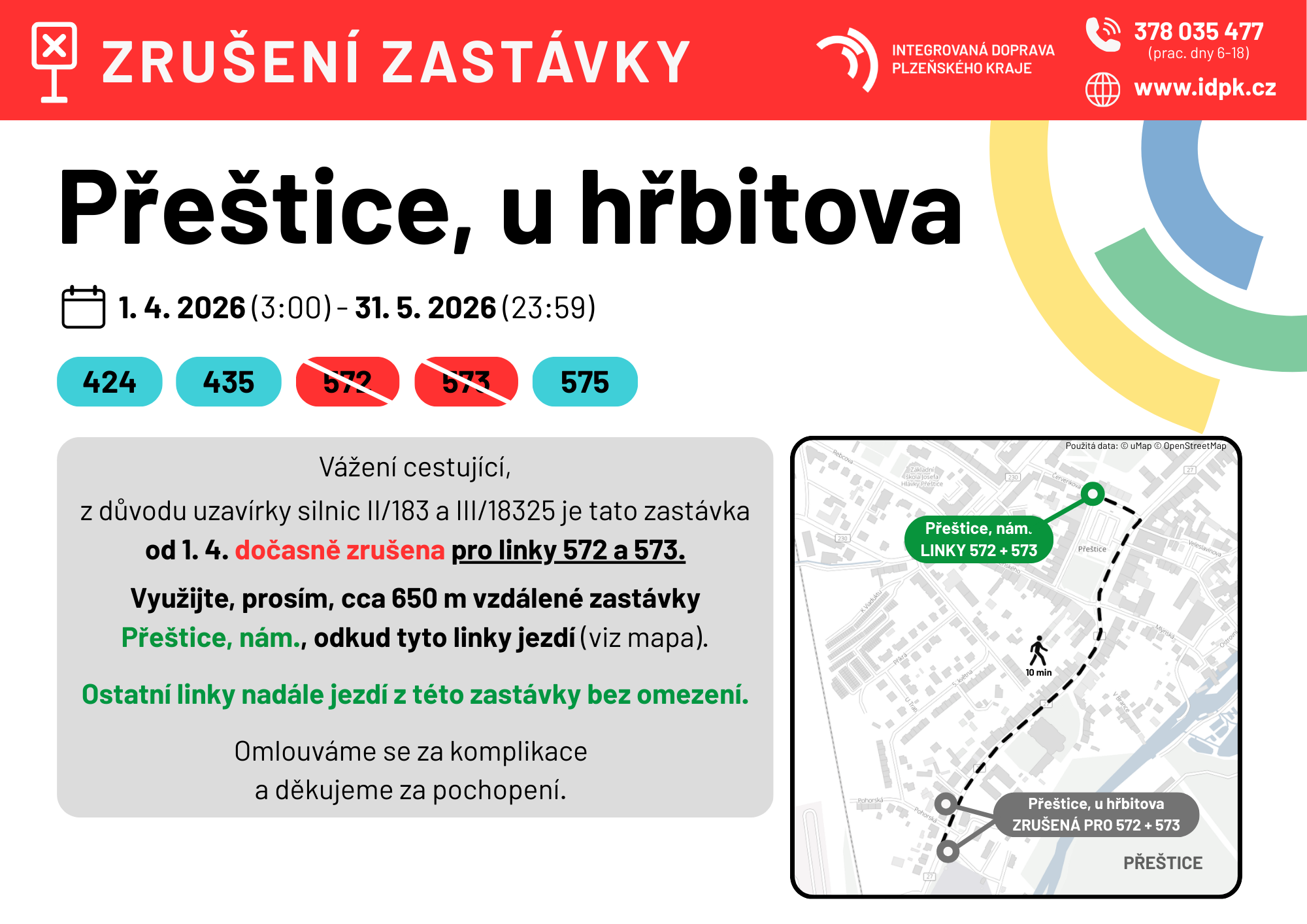 - Linky 572 a 573 ve směru Skočice budou ze zastávky Přeštice, nám. odjíždět z nástupiště č. 5!