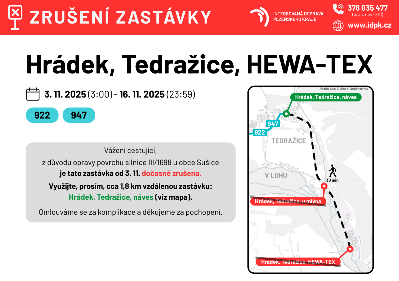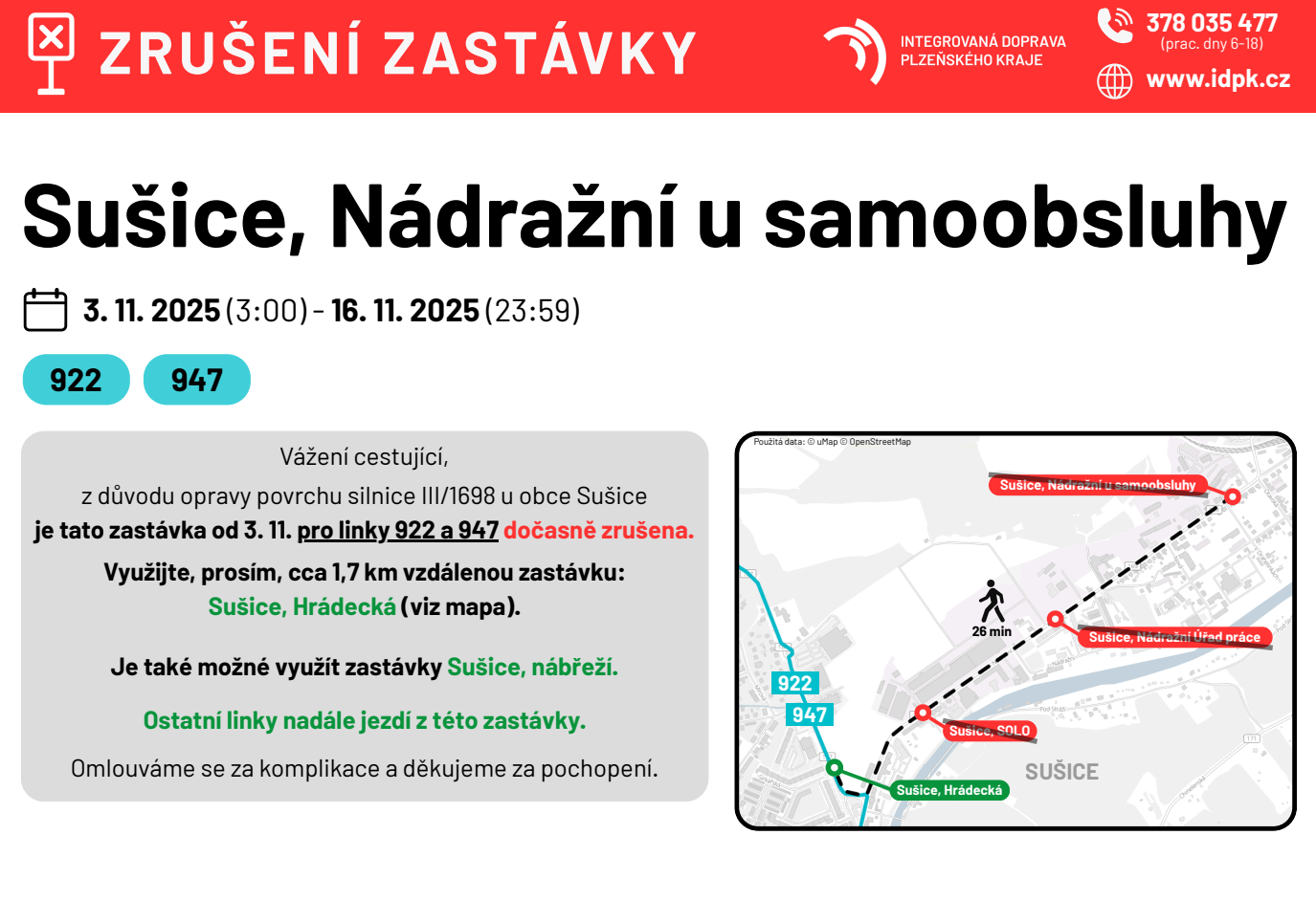 Z důvodu opravy povrchu silnice III/1698 u obce Sušice dojde od 3. 11. ke změnám na linkách 922 a 947.